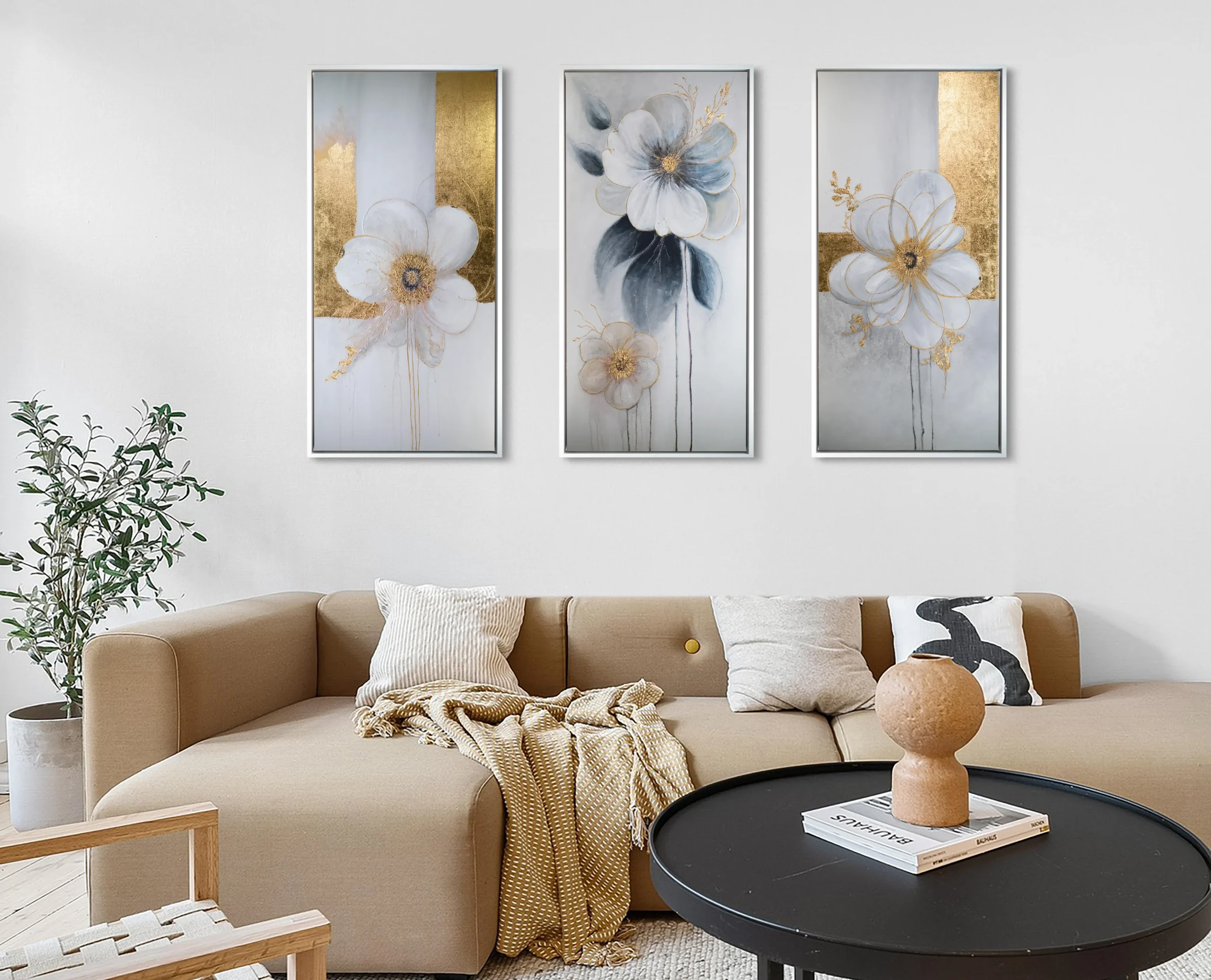 A refined triptych with hand-applied gold accents-warm, sculptural, quietly elevated.