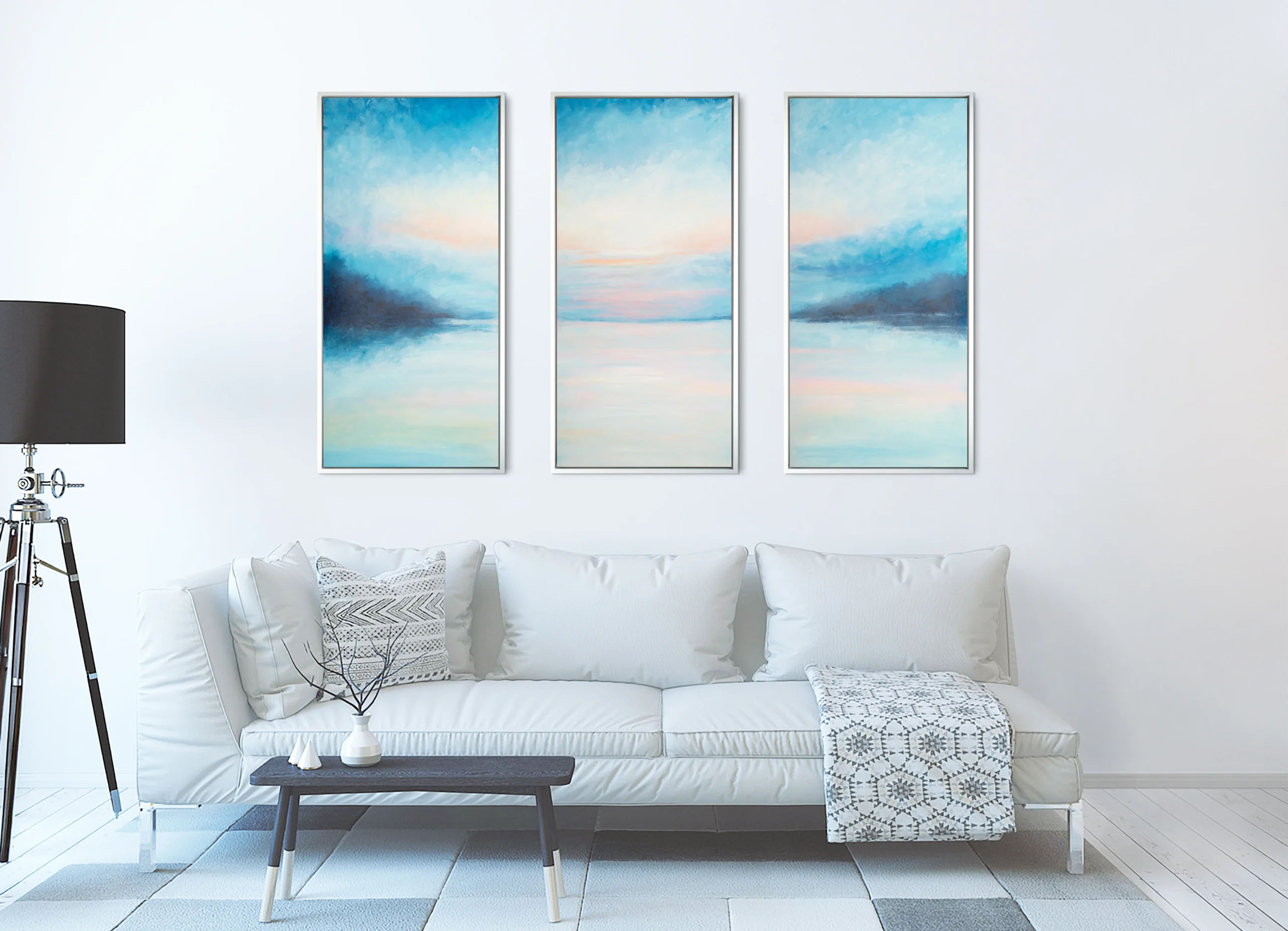 A tranquil triptych in soft blue and blush tones-airy, reflective, and quietly expansive.