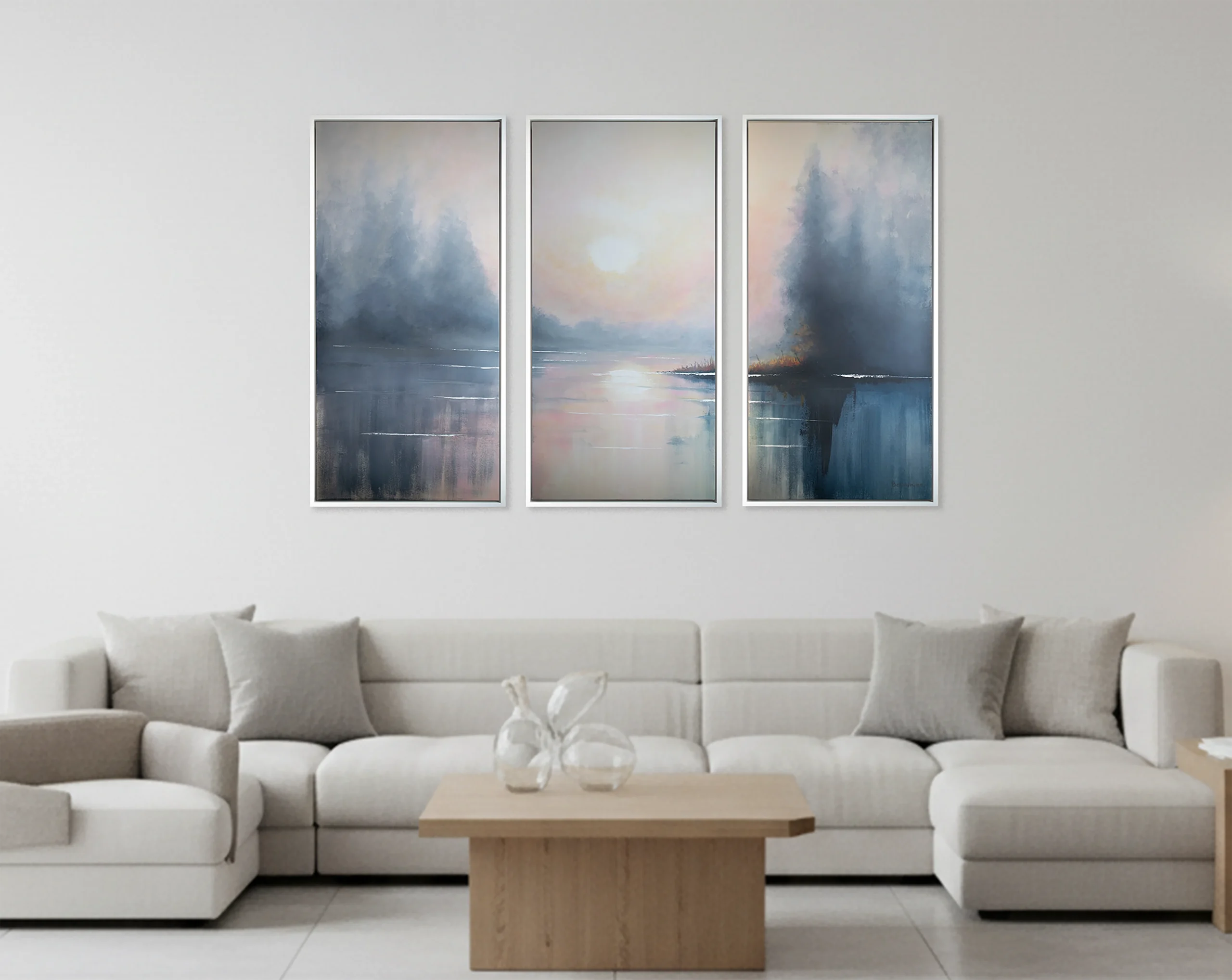 An atmospheric triptych that brings quiet depth, softness, and visual calm to larger spaces.