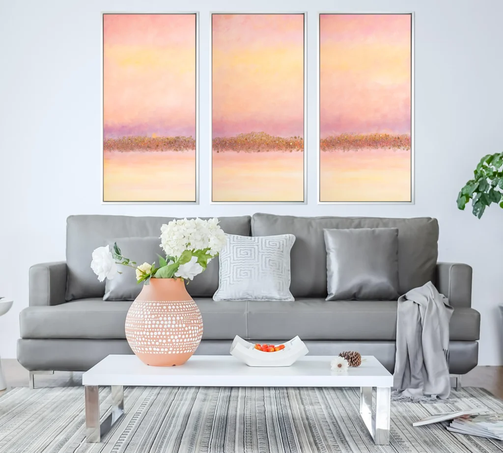 A luminous triptych in blush sunrise tones-designed to fill the room with peace and gentle radiance.